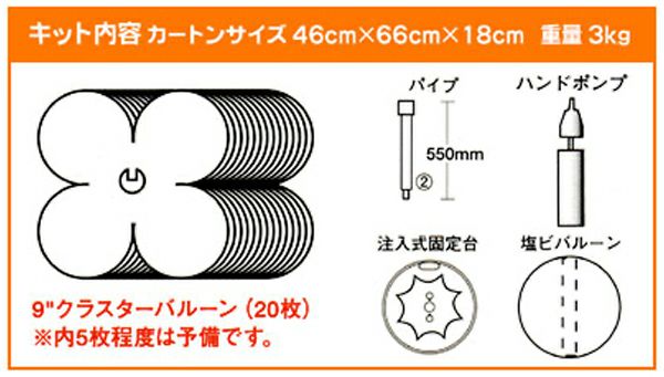 | キット内容 | ★9インチクラスターバルーン20枚※内5枚程度は予備です。 ★パイプ(長さ550mm) ★注入式固定代 ★塩ビバルーン ★ハンドポンプ |