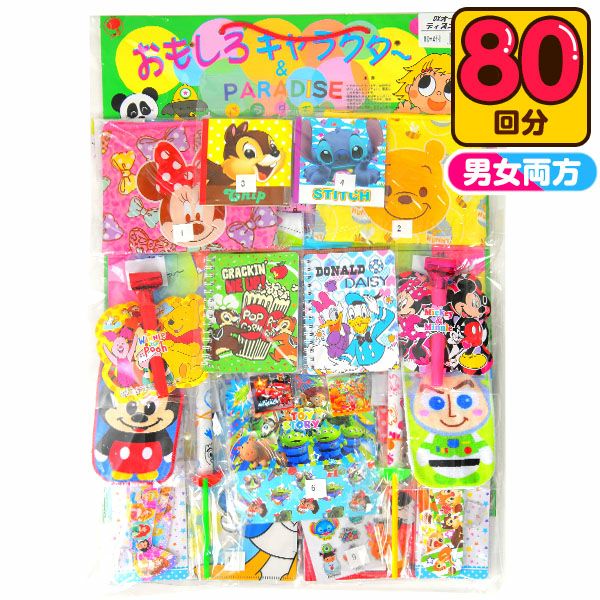 大当たり景品と小当たり景品が合計80個付いています。男の子も女の子も大好きなディズニーキャラのグッズがいっぱい!