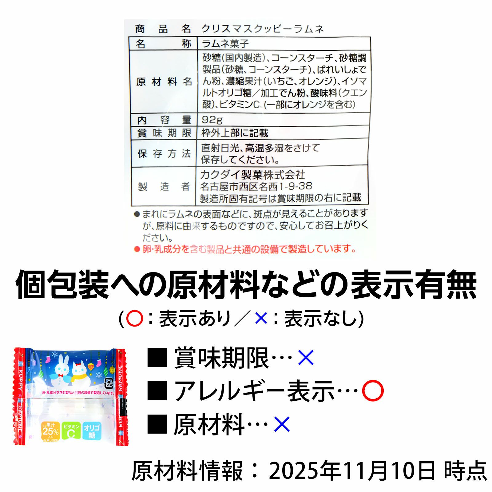 他の画像を見る 1個装あたり約8.4円(約9円税込)x約22個装入=184円(199円税込)クリスマス 2025 お菓子 着色料・香料不使用! クリスマスデザイン カクダイ クリスマスクッピーラムネ 92g(約22個装入) { クリスマスお菓子 クリスマス お菓子 個包装 子供 ラムネ クリスマス クッピー }{ クリスマス 2025 お菓子 サンタクロース 子供会 クリスマス会 プレゼント 詰め合わせ 個包装 }[25L17][dmo]{即日出荷 配送区分D} メーカー希望小売価格 オープン価格 のところ 当店特別価格 ¥ 199 税込 販売期間 2025/11/12 19:00 〜 2026/01/31 0:00 カートに入れる お気に入りに登録する