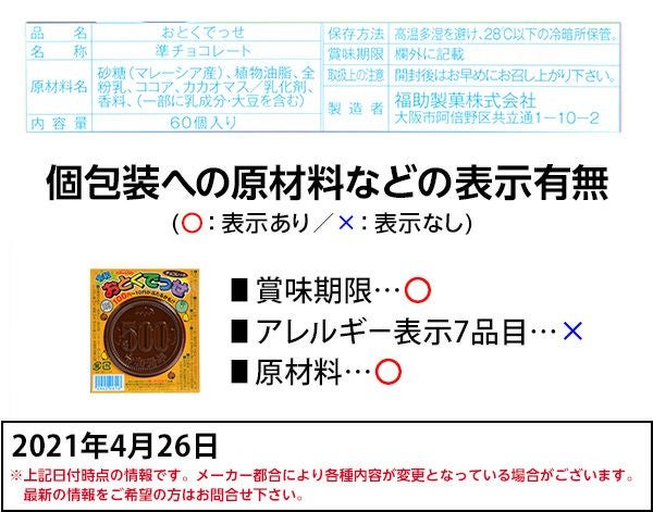 他の画像を見る 1個装あたり34円(約36.7円税込)x50個装入=1700円(1836円税込) 業務用 令和 おとくでっせ 50個装付 { 駄菓子 お菓子 チョコレート チョコ 大量 }{ 子供会 景品 お祭り 縁日 問屋 }[25J30][dmo] メーカー希望小売価格 ¥ 2,160 のところ 当店特別価格 ¥ 1,836 税込 カートに入れる お気に入りに登録する