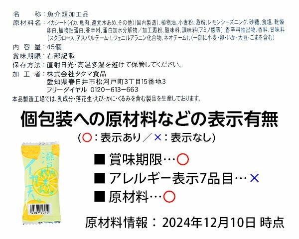 他の画像を見る 1個装あたり9.2円(約9.9円税込)x45個装入=414円(447円税込)サクサクおいしい☆すっぱ美味しい レモンのさっぱり感とイカ天のコクのある旨味 イカ天 瀬戸内レモン味 45個装入 { 駄菓子 お菓子 おつまみ いか 宅飲み 家飲み 揚げせんべい レモン }{ おかし おやつ 景品 お祭り 夏祭り 縁日 問屋 子供 子供会 詰め合わせ 大量 パーティー イベント 配布 }[26B04][dmo] メーカー希望小売価格 オープン価格 のところ 当店特別価格 ¥ 447 税込 カートに入れる お気に入りに登録する