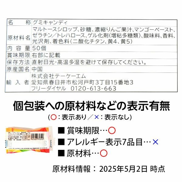 他の画像を見る 単価8.5円(約9.2円税込)x50個装入=425円(459円税込)トロピカルな完熟マンゴーの香りたっぷりグミ やおきん 完熟マンゴー グミ 50個装入 { 駄菓子 お菓子 マンゴー グミ フルーツ 果物 }{ おかし おやつ 景品 お祭り 夏祭り 縁日 問屋 子供 子供会 自治会 詰め合わせ 大量 幼稚園 パーティー イベント 配布 個装 }[25E12][dmo] メーカー希望小売価格 ¥ 540 のところ 当店特別価格 ¥ 459 税込 カートに入れる お気に入りに登録する