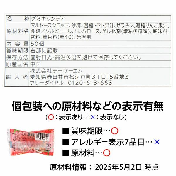 他の画像を見る 単価8.5円(約9.2円税込)x50個装入=425円(459円税込)甘酸っぱいトマトの味わいと塩味がくせになるグミ もっちり 塩トマト グミ 50個装入 { 駄菓子 お菓子 トマト グミ フルーツ 野菜 }{ おかし おやつ 景品 お祭り 夏祭り 縁日 問屋 子供 子供会 自治会 詰め合わせ 大量 幼稚園 パーティー イベント 配布 個装 }[25E10][dmo] メーカー希望小売価格 ¥ 540 のところ 当店特別価格 ¥ 459 税込 カートに入れる お気に入りに登録する