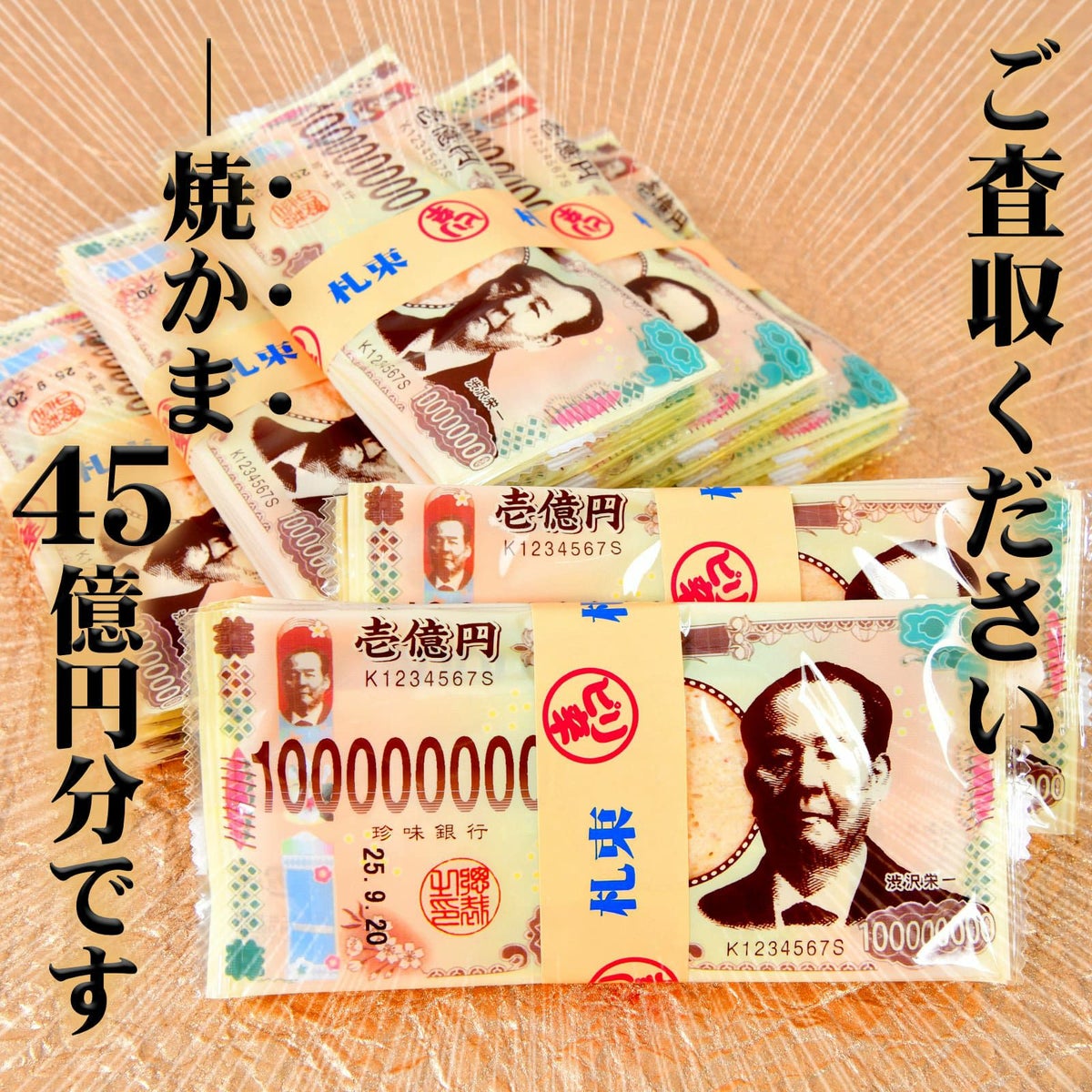 他の画像を見る 1個装あたり約18.7円(20.2円税込)x45個装入=842円(909円税込)開けてビックリ!中身はカマ!?ぜんぶ合わせて…総額45億カマ! 渋沢栄一 お札束 45個装入 { 駄菓子 お菓子 一億円 お札 お金 おつまみ 焼きかま おもしろい ジョーク }{ おかし おやつ 景品 お祭り 夏祭り 縁日 問屋 子供 会 詰め合わせ 大量 }[25K02][dmo] メーカー希望小売価格 ¥ 1,069 のところ 当店特別価格 ¥ 909 税込 カートに入れる お気に入りに登録する