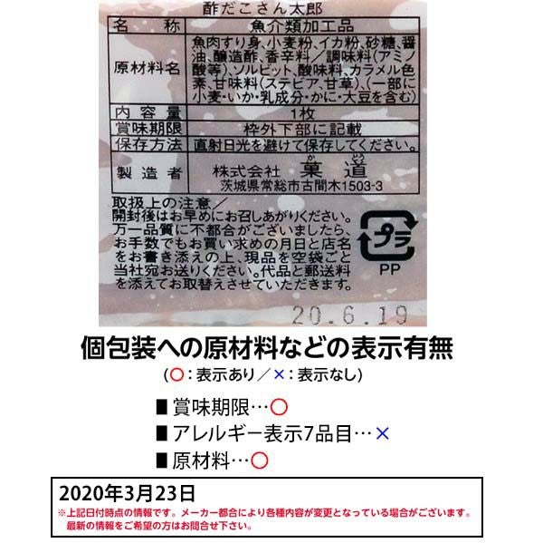 他の画像を見る 1個装あたり約12.8円(13.8円税込)x30個装入=383円(414円税込) 酢だこさん太郎 30個装入 { 駄菓子 お菓子 酢ダコ おつまみ 珍味 }{ 子供会 景品 お祭り くじ引き 縁日 販促 配布 夏祭り 幼稚園 保育園 問屋 }[24G19] メーカー希望小売価格 オープン価格 のところ 当店特別価格 ¥ 414 税込 カートに入れる お気に入りに登録する