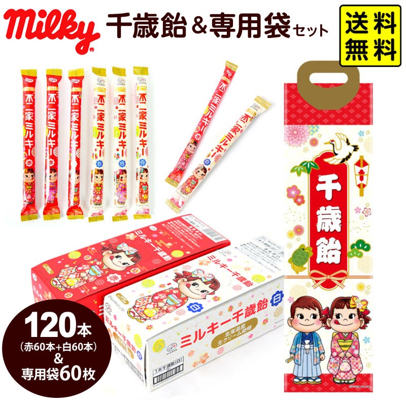 ミルキーの千歳飴120本、千歳飴袋60枚のセットです。