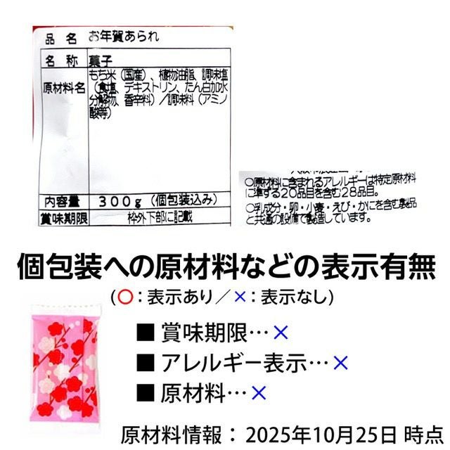 他の画像を見る 1個装あたり約14円(約15.1円税込)x約111個装入=1556円(1680円税込)おめでたいモチーフがちりばめられたひとくちあられ☆年末年始のご挨拶に お年賀あられ 300g(約111個装入) { 駄菓子 お菓子 ばらまき お菓子 おかし 2026 新年 お正月 詰め合わせ お祝い ご挨拶 }{ お年玉 おめでたい お菓子 お年賀 あられ おせんべい 配布 販促 個装 個包装 }[25J20][dmo] メーカー希望小売価格 オープン価格 のところ 当店特別価格 ¥ 1,680 税込 在庫切れ 再入荷お知らせ お気に入りに登録する