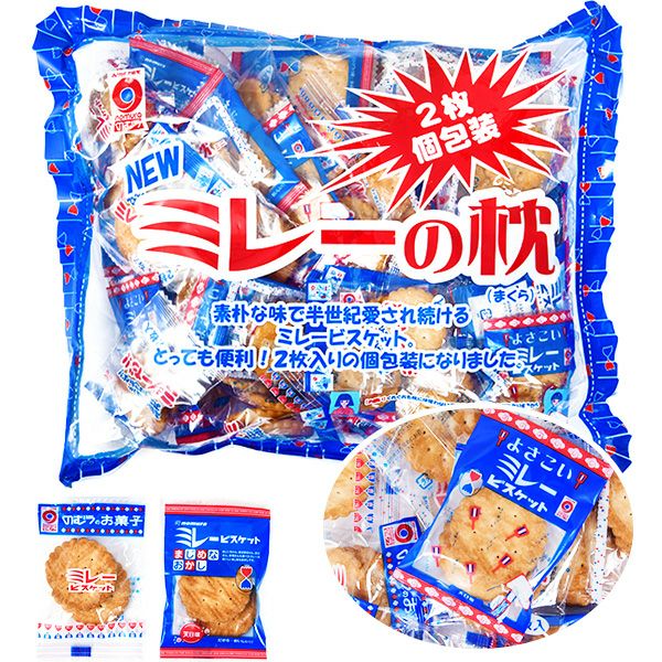 他の画像を見る 1個装あたり約25.4円(約27.4円税込)x約35個装入=888円(959円税込) NEW ミレーの枕 (2枚 個包装) 350g(約35個装入) { 駄菓子 ビスケット ミレー 個包装 配布 }{ お菓子 子供会 景品 お祭り くじ引き 縁日 販促 配布 夏祭り 幼稚園 保育園 問屋 }126[22L05] 大袋菓子 メーカー希望小売価格 オープン価格 のところ 当店特別価格 ¥ 959 税込 カートに入れる お気に入りに登録する