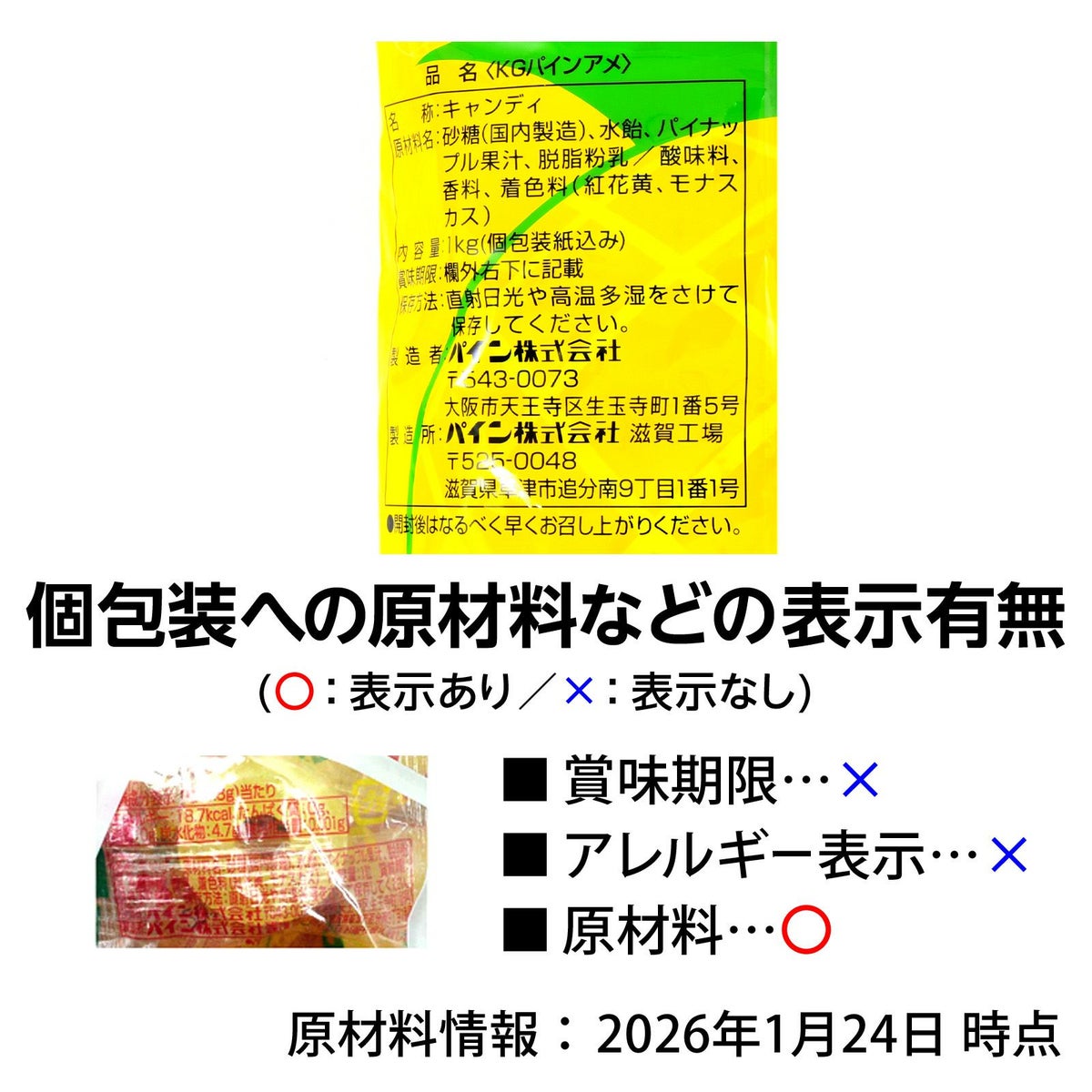 他の画像を見る 1個装あたり約5.6円(約6円税込)x約205個装入=1148円(1240円税込)甘酸っぱくてジューシー! パイン パインアメ 1kg(約205個装入) { 駄菓子 お菓子 パイン飴 アメ パインあめ キャンディー 個包装 業務用 大袋 }{ 子供会 お祭り 縁日 販促 配布 イベント 粗品 つかみどり 夏祭り 幼稚園 保育園 }[26A26][dmo] メーカー希望小売価格 オープン価格 のところ 当店特別価格 ¥ 1,240 税込 カートに入れる お気に入りに登録する