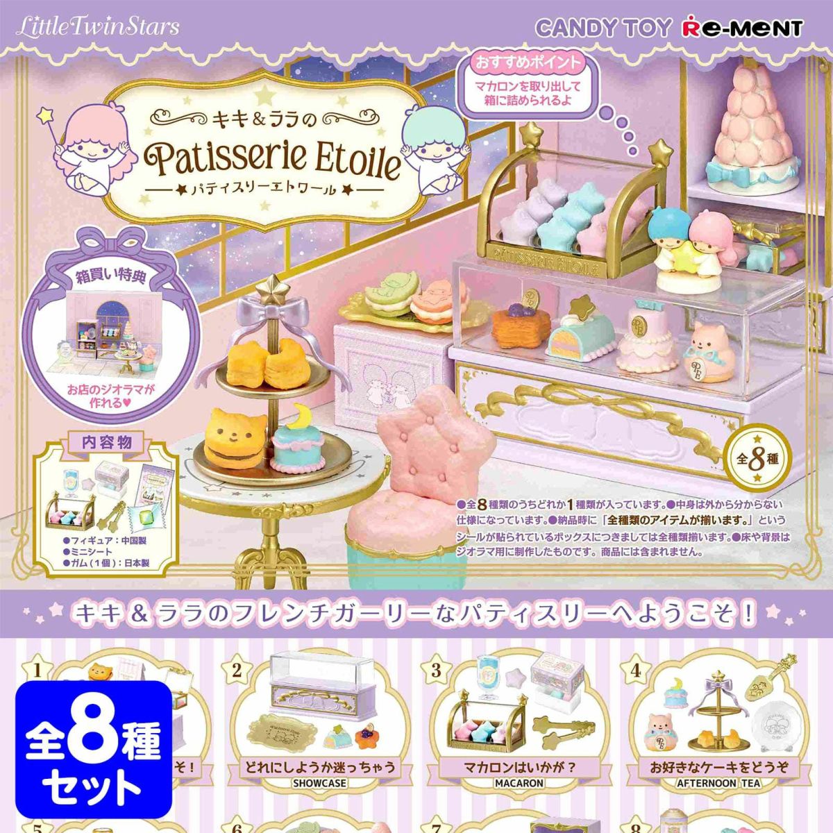 他の画像を見る 1個装あたり735円(808.5円税込)x8個装入=5880円(6468円税込)全8種 コンプリート(全種類のアイテムが揃います。) リーメント LittleTwinStars キキ&ララのPatisserie Etoile 8個装入 { 食玩 景品玩具 サンリオ リトルツインスター キキララ パティスリー エトワール }{ おもちゃ フィギュア コレクション ギフト プレゼント }[25L27][dmo]{即日出荷 配送区分D} メーカー希望小売価格 ¥ 9,240 のところ 当店特別価格 ¥ 6,468 税込 在庫切れ 再入荷お知らせ お気に入りに登録する