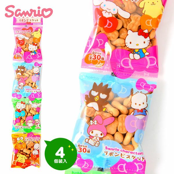 ひとくちサイズで食べやすい!リボンのかたちのかわいいミルク味のビスケット!ハローキティとリボンがビスケットにプリント入り。