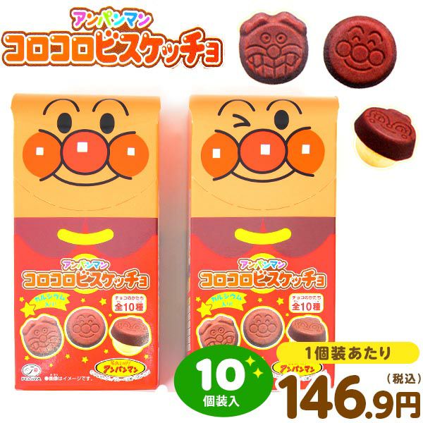 カルシウム入のひとくちチョコビスケット☆10種類のキャラクターがそれぞれ描かれた小粒のチョコレートに、カルシウム入りの球状のビスケットを貼り合せた、サクサク食べられるスタンプ型の「見て楽しい、食べておいしい」アンパンマンのチョコスナックです。