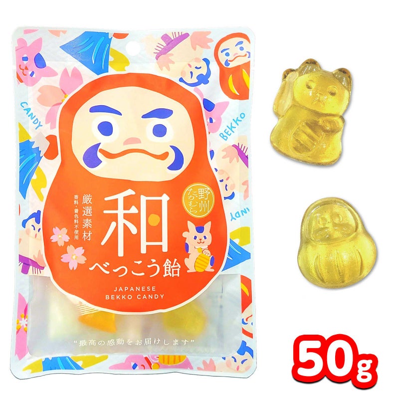 日本の素晴らしい文化を皆様にお届けしたく、可愛い日本のモチーフ(「招き猫」「だるま」「さくら」「相撲」「富士山」)でつくった、金色に輝くべっこう飴です。