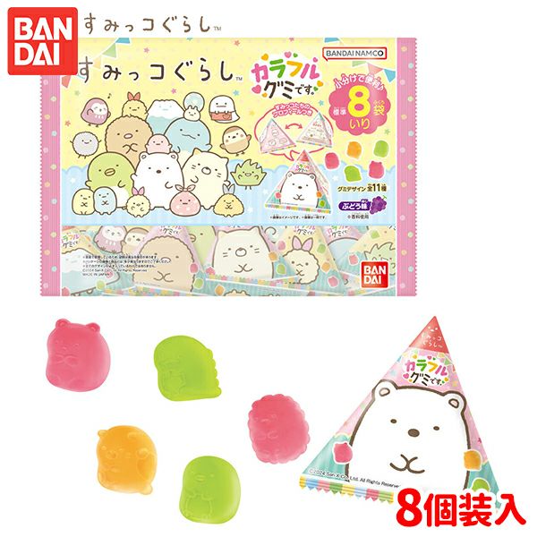 「すみっコぐらし」のカラフルな小粒グミが入ったバラエティパック!テトラパックの個包装には3面にすみっコたちのプロフィール情報記載!