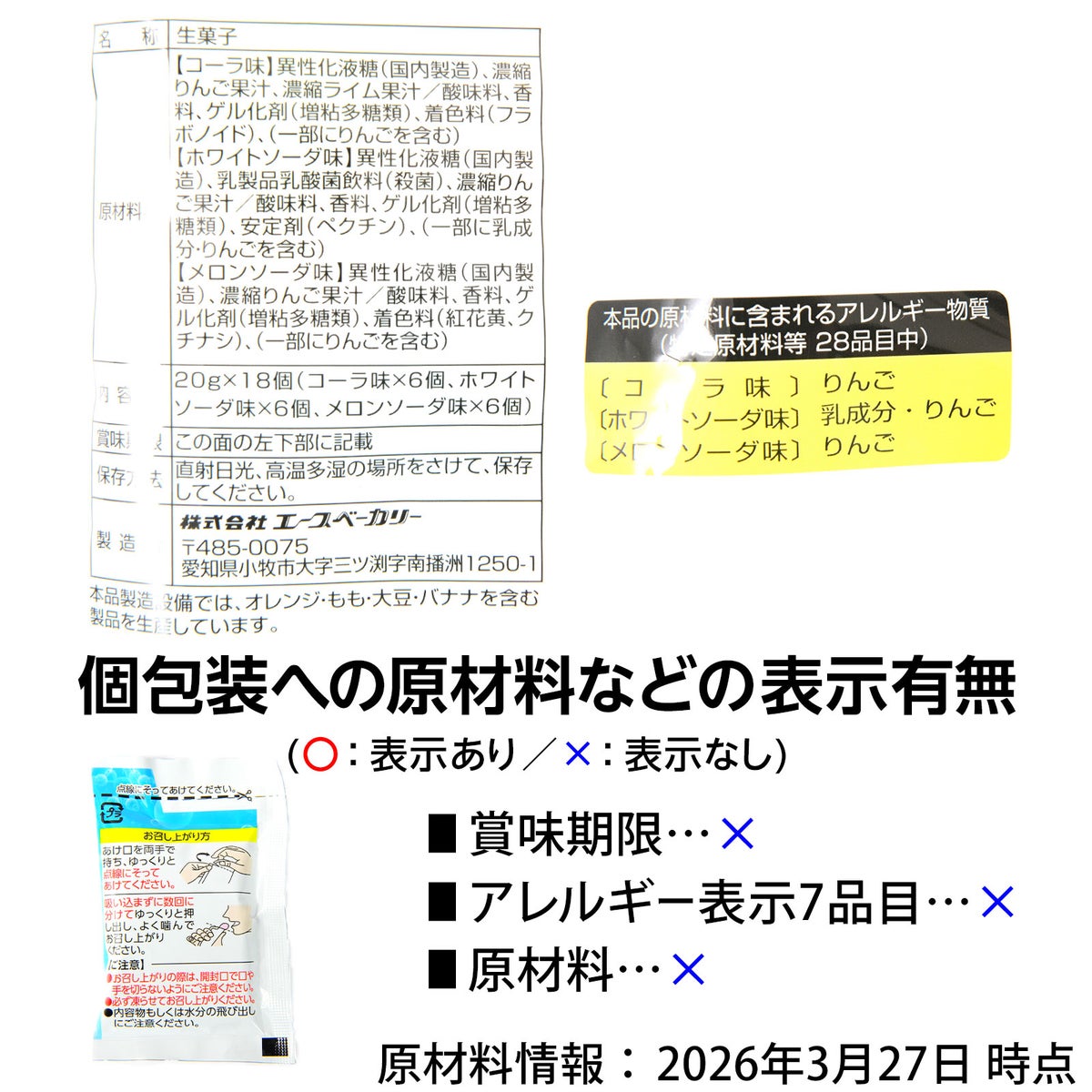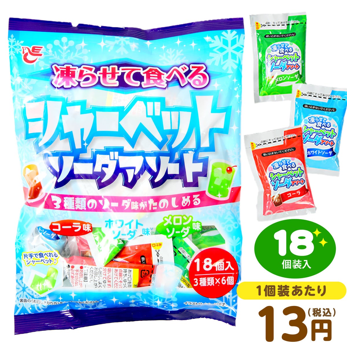 他の画像を見る 1個装あたり約12.1円(13円税込)x18個装入=217円(234円税込)コーラ、ホワイトソーダ、メロンソーダ味のシャーベット エースベーカリー 凍らせて食べる シャーベット ソーダ アソート 18個装入 { 駄菓子 お菓子 シャーベット アイス 冷凍 パウチ }{ おかし おやつ 景品 お祭り 縁日 子供 詰め合わせ まとめ買い 保育園 幼稚園 パーティー イベント 配布 }107[26C25][dmo] メーカー希望小売価格 ¥ 324 のところ 当店特別価格 ¥ 234 税込 カートに入れる お気に入りに登録する