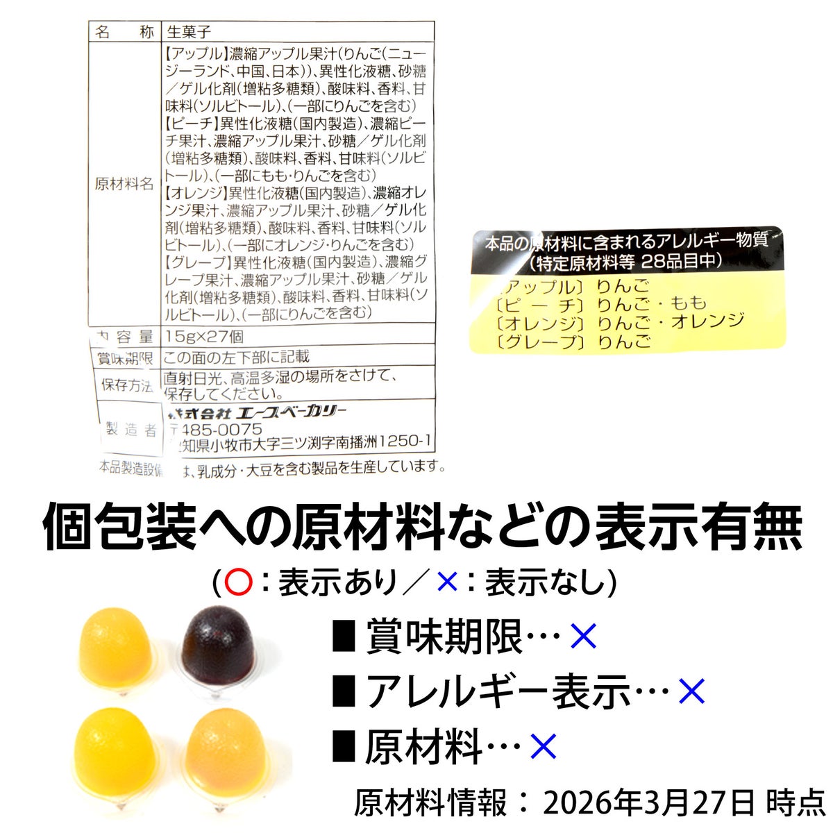 他の画像を見る 1個装あたり約11.7円(約12.7円税込)x27個装入=317円(342円税込)果汁の贅沢な味わいを楽しめるフルーツゼリー エースベーカリー 果汁100% ゼリー 27個装入 { 駄菓子 お菓子 ゼリー 果物 くだもの フルーツ }{ おかし おやつ 景品 お祭り 縁日 問屋 子供 子供会 お子様ランチ 詰め合わせ 大量 まとめ買い 保育園 幼稚園 パーティー イベント 配布 }107[26C25][dmo] メーカー希望小売価格 ¥ 432 のところ 当店特別価格 ¥ 342 税込 カートに入れる お気に入りに登録する