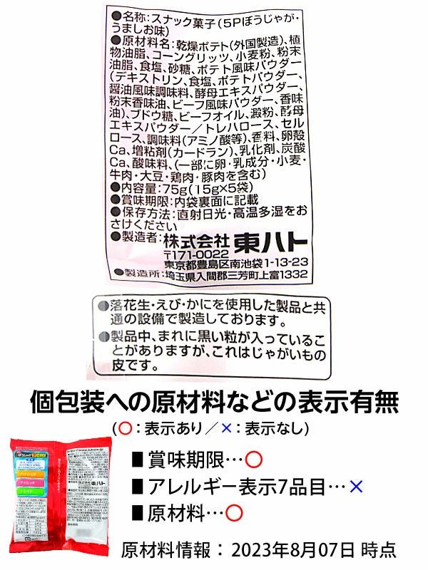 他の画像を見る 1個装あたり56.2円(60.6円税込)x5個装入=281円(303円税込)クセになる!フライドポテトの風味 東ハト ぼうじゃが 5P うましお 5個装入 { 駄菓子 お菓子 スナック菓子 ポテトスナック じゃがいも 小分け }{ おかし おやつ 景品 お祭り 縁日 問屋 子供 子供会 詰め合わせ 大量 まとめ買い 保育園 幼稚園 パーティー イベント 配布 }[25I15][dmo] メーカー希望小売価格 ¥ 356 のところ 当店特別価格 ¥ 303 税込 カートに入れる お気に入りに登録する