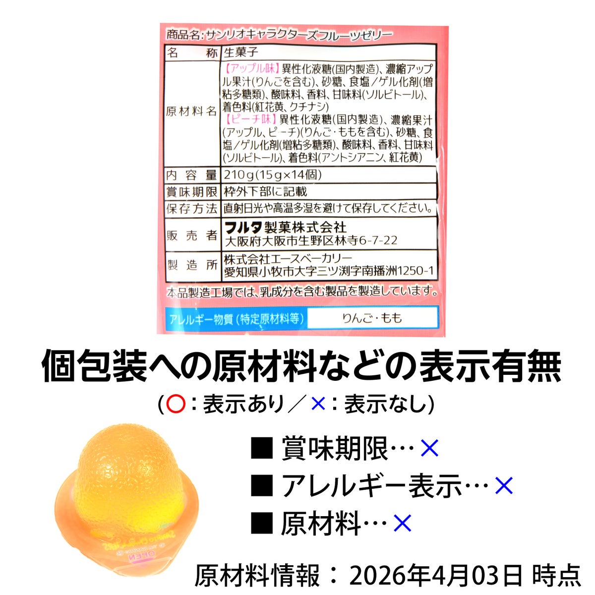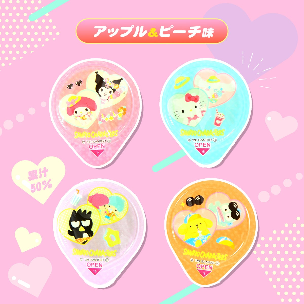 他の画像を見る 1個装あたり約19.3円(約20.9円税込)x約14個装入=270円(292円税込)おやつにやお弁当に添えてもGOOD! フルタ サンリオキャラクターズ フルーツ ゼリー 210g(約14個装入) { 駄菓子 お菓子 サンリオ サンリオキャラクターズ フルーツ ゼリー }{ おかし おやつ 子供会 景品 子供 お祭り くじ引き 縁日 販促 配布 夏祭り 問屋 パーティー イベント }[26C28][dmo] メーカー希望小売価格 ¥ 378 のところ 当店特別価格 ¥ 292 税込 カートに入れる お気に入りに登録する