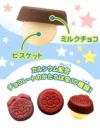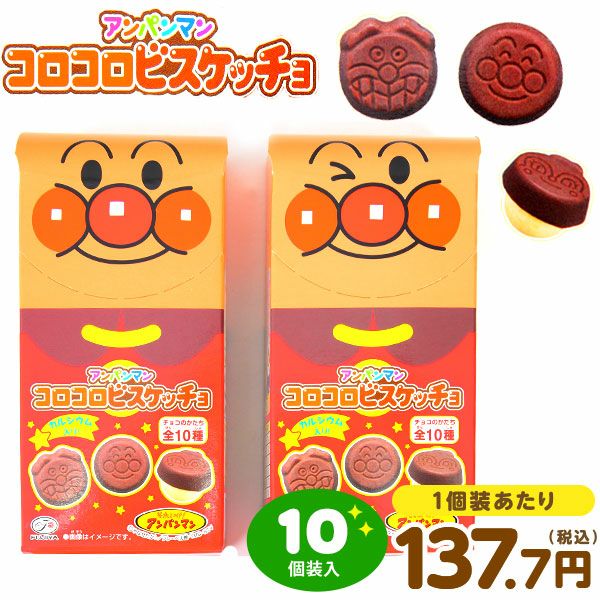 カルシウム入のひとくちチョコビスケット☆10種類のキャラクターがそれぞれ描かれた小粒のチョコレートに、カルシウム入りの球状のビスケットを貼り合せた、サクサク食べられるスタンプ型の「見て楽しい、食べておいしい」アンパンマンのチョコスナックです。