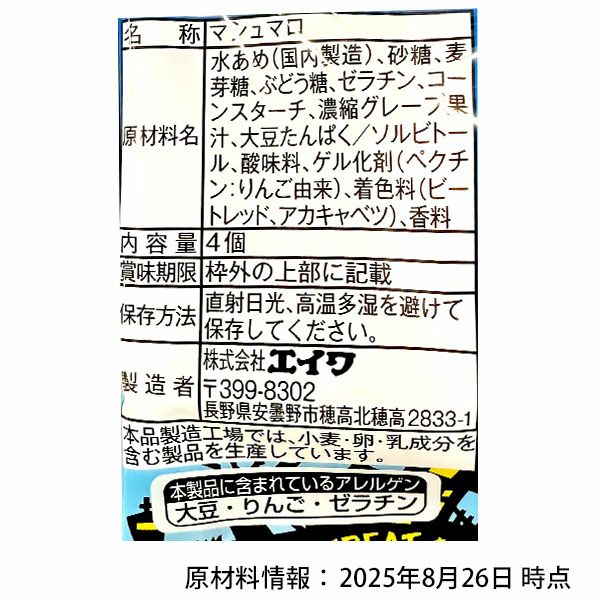 他の画像を見る 1個装あたり35円(約37.8円税込)x4個装入=140円(151円税込)グレープソース入りゼリー入りの満足マシュマロ♪ エイワ ハロウィン グレープマシュマロ 4連 4個装入 { ハロウィン菓子 マシュマロ グレープ ぶどう イベント 販促 パーティー 業務用 特価 大量 小袋 }{ プチギフト お菓子 限定 限定パッケージ 個包装 配布 }[25K10][dmo]{即日出荷 配送区分D} メーカー希望小売価格 オープン価格 のところ 当店特別価格 ¥ 151 税込 販売期間 2025/11/10 12:00 〜 2026/01/08 7:30 カートに入れる お気に入りに登録する