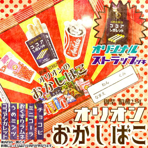 創業昭和23年!昔ながらのお菓子で有名なオリオンのベストセレクションが登場!王道のココアシガレットを筆頭にシガレットシリーズや梅ミンツ、お薬ラムネまでぎっしり詰め合わせ!そしてなんと・・・数量限定オリオンのオリジナルストラップ付きですよ~!