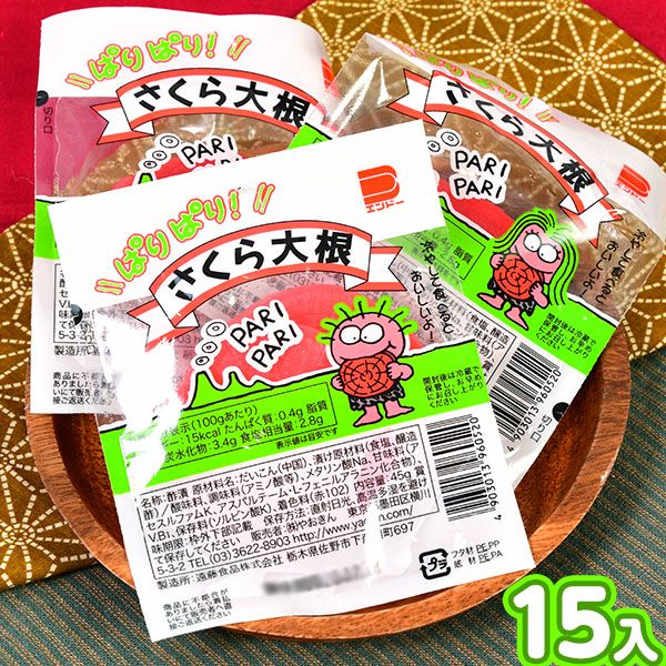 | 原材料 | だいこん(中国)、漬け原材料(醸造酢、食塩)/酸味料、調味料(アミノ酸等)、メタリン酸Na、甘味料(アセスルファムK、アスパルテーム・Lフェニルアラニン化合物)、V.B1、保存料(ソルビン酸K)、ビタミンB1、着色料(赤102) |