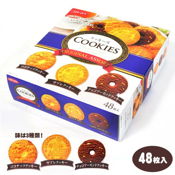 香り豊かなクッキーで幸せなひとときを・・・。ココナッツクッキー、サブレクッキー、チョコアーモンドクッキーの3種類が48枚入。