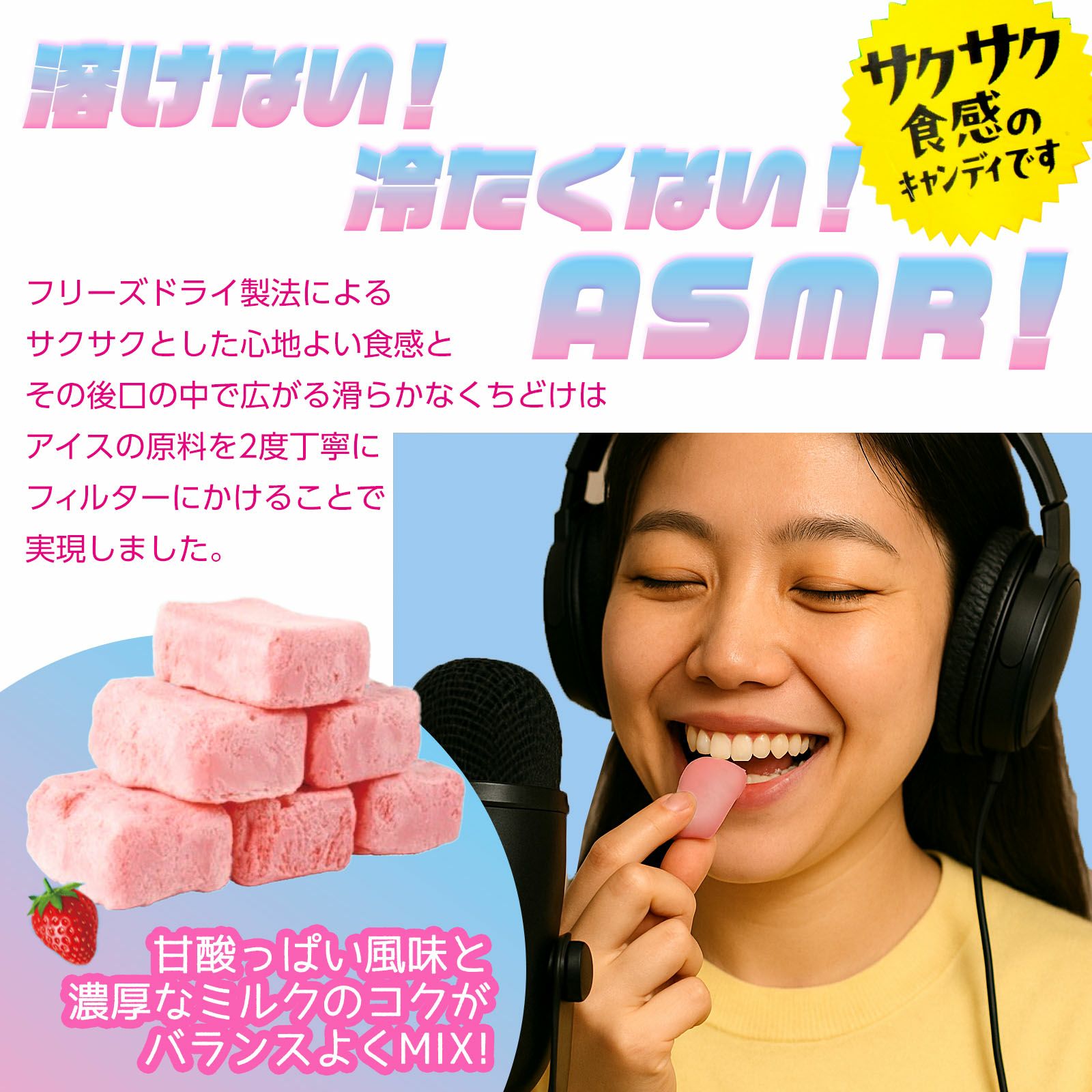 アイスクリーム!なんと!本物のアイスクリームをフリーズドライにした、冷たくないアイスクリームキャンディです。