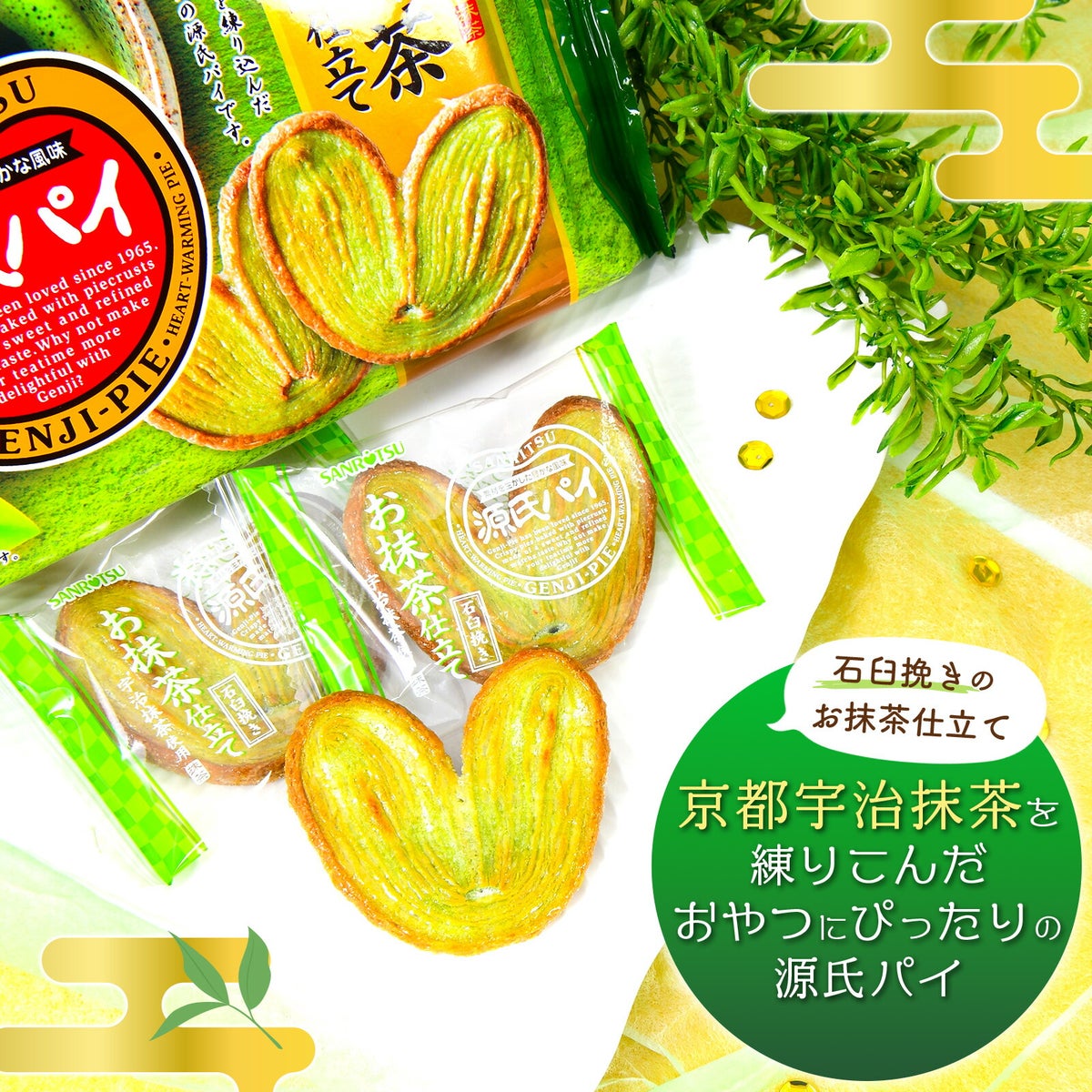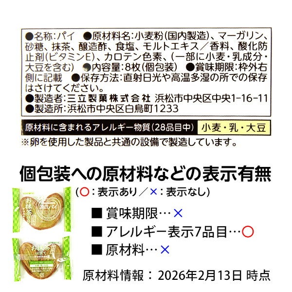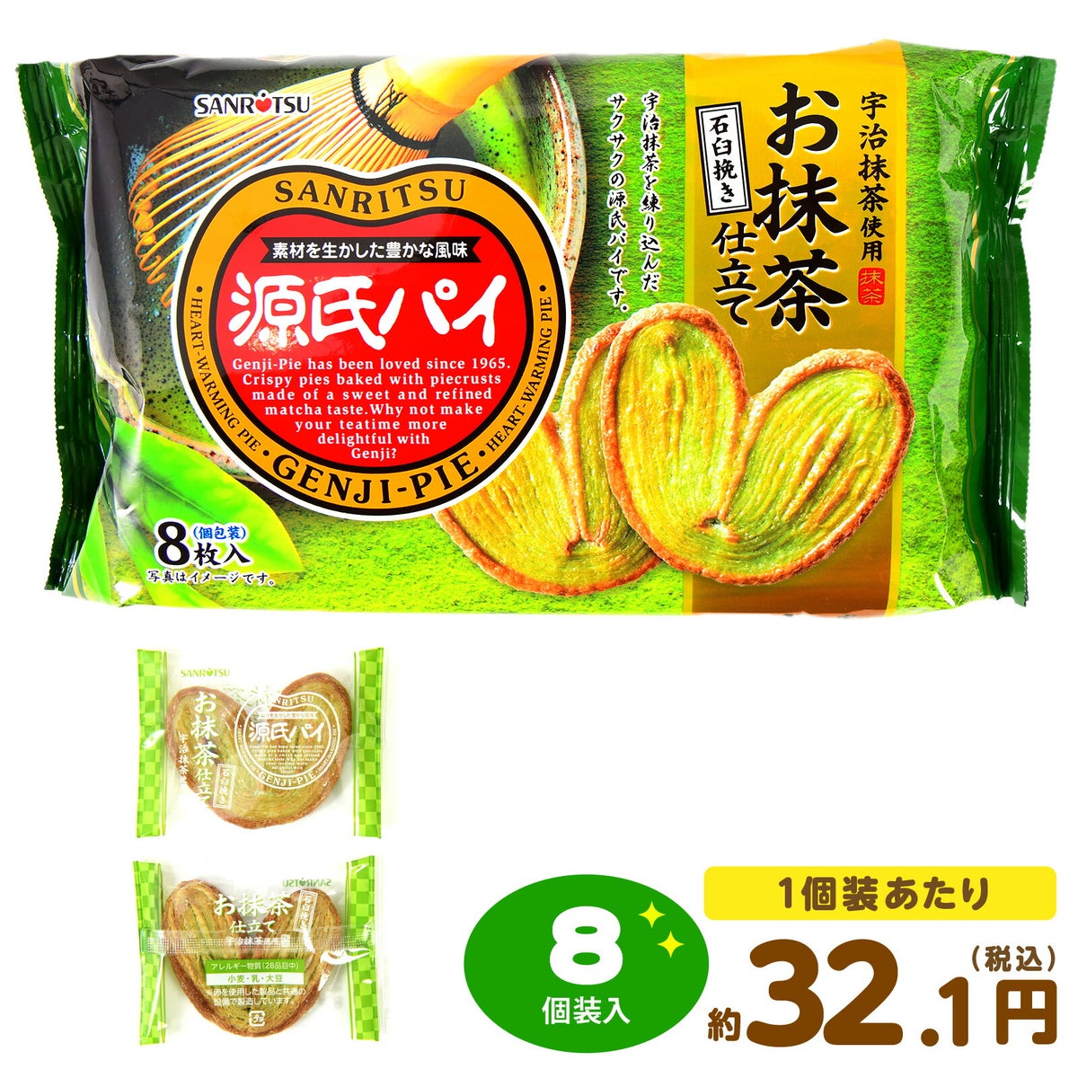 他の画像を見る 1個装あたり約29.8円(約32.1円税込)x8個装入=238円(257円税込)期間限定!京都宇治抹茶を練りこんだ源氏パイ 三立製菓 源氏パイ お抹茶仕立て 8個装入 { 駄菓子 お菓子 限定 抹茶 パイ spring }{ おかし おやつ 景品 お祭り 縁日 問屋 子供 子供会 まとめ買い パーティー イベント 配布 }[26C04][dmo] メーカー希望小売価格 ¥ 302 のところ 当店特別価格 ¥ 257 税込 在庫切れ 再入荷お知らせ お気に入りに登録する