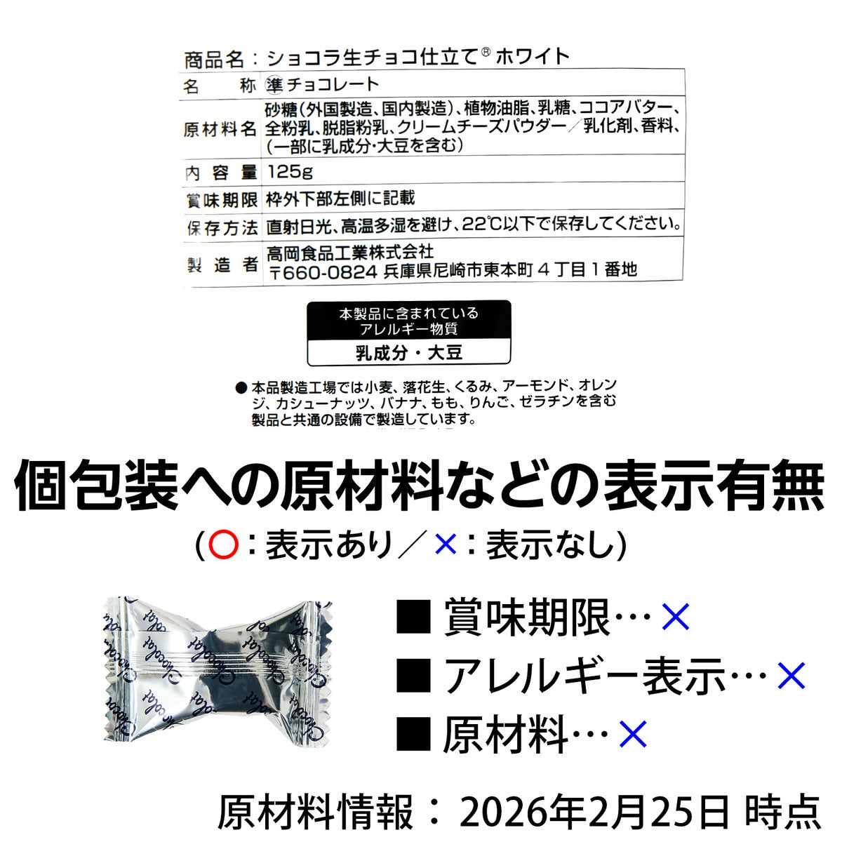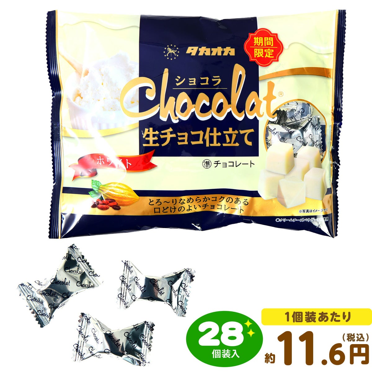 他の画像を見る 1個装あたり約10.8円(約11.6円税込)x約28個装入=302円(326円税込)限定!コクのある味わいと優しく濃厚な甘みが クセになる美味しさ タカオカ ショコラ 生チョコ仕立て ホワイト 125g(約28個装入) { 駄菓子 お菓子 限定 チョコ チョコレート 生チョコ ホワイトチョコ spring }{ おかし おやつ 景品 お祭り 夏祭り 縁日 問屋 子供 子供会 詰め合わせ 大量 イベント 配布 個装 }[26C04][dmo] メーカー希望小売価格 オープン価格 のところ 当店特別価格 ¥ 326 税込 在庫切れ 詳細を見る お気に入りに登録する