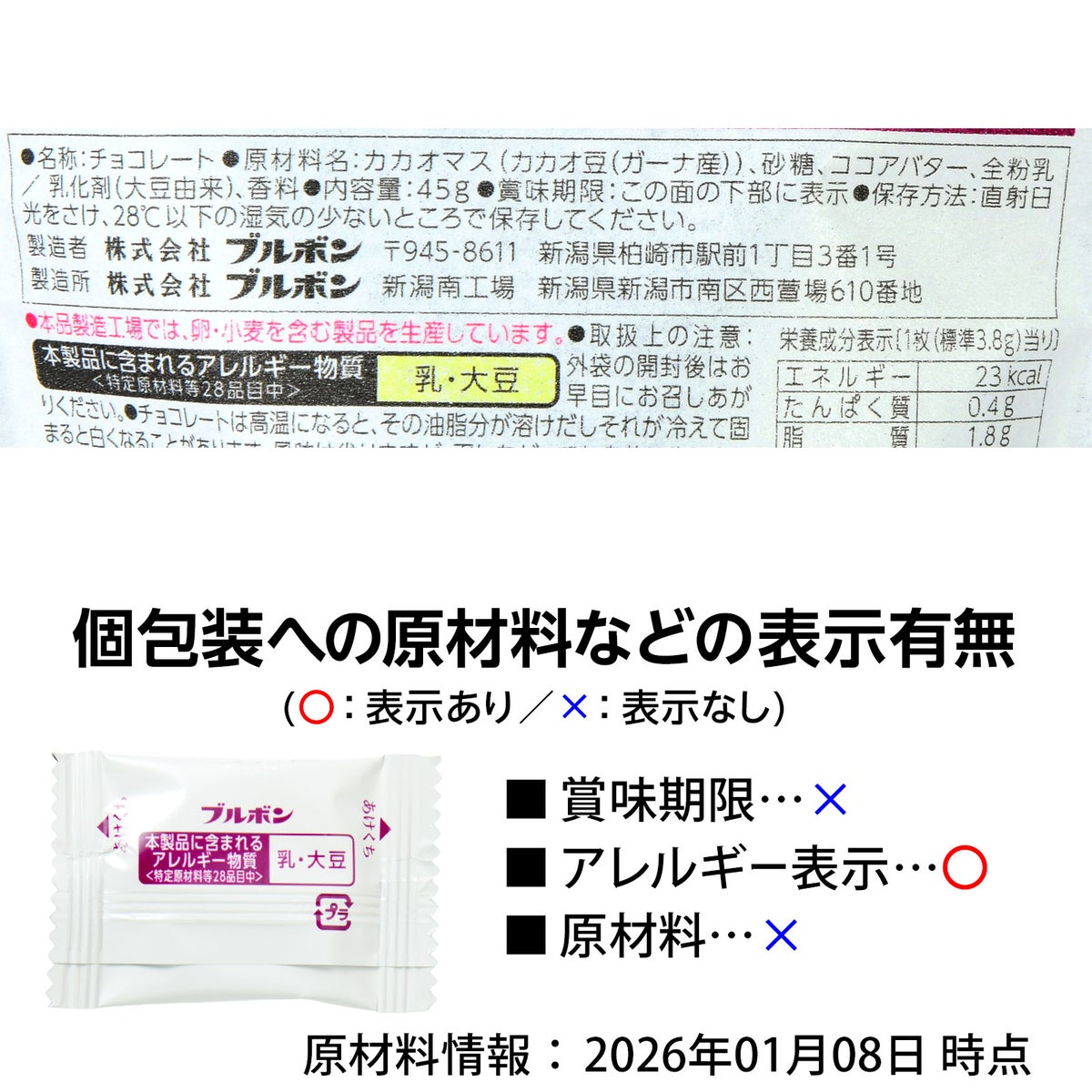 他の画像を見る 1個装あたり約32.6円(約35.2円税込)x約12個装入=391円(422円税込)新潟県魚沼の雪室で熟成させた雑味の少ないハイカカオチョコレート ブルボン 雪室ショコラ 熟成カカオ73 ( 45g(約12個装入) ) { 駄菓子 お菓子 チョコ チョコレート ハイカカオ }{ お菓子 おかし おやつ 詰め合わせ パーティー イベント 配布 景品 くじ くじ引き お祭り 縁日 問屋 子供 子供会 }[26C04][dmo] メーカー希望小売価格 ¥ 497 のところ 当店特別価格 ¥ 422 税込 詳細を見る お気に入りに登録する
