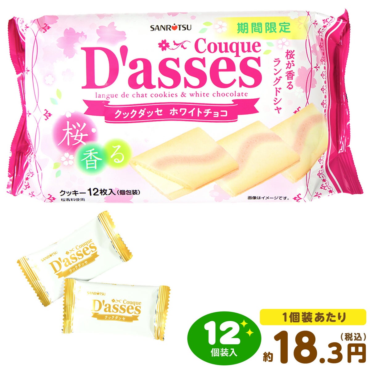 他の画像を見る 1個装あたり17円(約18.3円税込)x12個装入=204円(220円税込)春限定! ”ふわっ”と桜香るラングドシャとホワイトチョコの組み合わせ 三立製菓 桜香るクックダッセ ホワイトチョコ 12個装入 { 駄菓子 お菓子 限定 桜 春 クッキー チョコ spring }{ おかし おやつ 子供 子供会 人気 お祭り 縁日 イベント 景品 詰め合わせ }[26C04][dmo] メーカー希望小売価格 ¥ 259 のところ 当店特別価格 ¥ 220 税込 在庫切れ 再入荷お知らせ お気に入りに登録する
