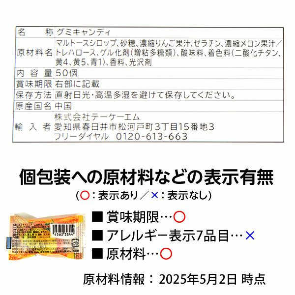 他の画像を見る 単価8.5円(約9.2円税込)x50個装入=425円(459円税込)甘―いメロンの香りがたまらないグミ 完熟メロン グミ 50個装入 { 駄菓子 お菓子 メロン グミ フルーツ 果物 }{ おかし おやつ 景品 お祭り 夏祭り 縁日 問屋 子供 子供会 自治会 詰め合わせ 大量 幼稚園 パーティー イベント 配布 個装 }[25E10][dmo] メーカー希望小売価格 ¥ 540 のところ 当店特別価格 ¥ 459 税込 カートに入れる お気に入りに登録する