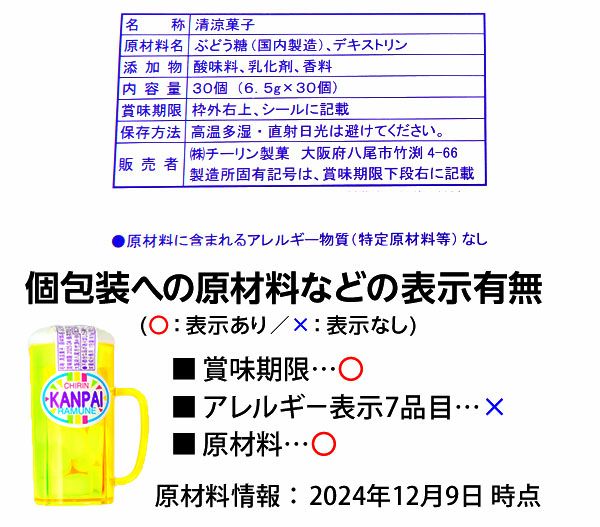 他の画像を見る 単価34円(約36.7円税込)x30個入=1020円(1102円税込)子どもだって『カンパイ』したい!ジョッキ片手に今夜はコレでキめよう! チーリン製菓 カンパイラムネ 30個入 { 駄菓子 お菓子 ラムネ ラムネ菓子 かんぱい カンパイ 乾杯 ジョッキ }{ おかし おやつ 景品 お祭り 夏祭り 縁日 問屋 子供 子供会 お子様ランチ 詰め合わせ 大量 保育園 幼稚園 パーティー イベント 配布 }[24K04] メーカー希望小売価格 ¥ 1,296 のところ 当店特別価格 ¥ 1,102 税込 カートに入れる お気に入りに登録する