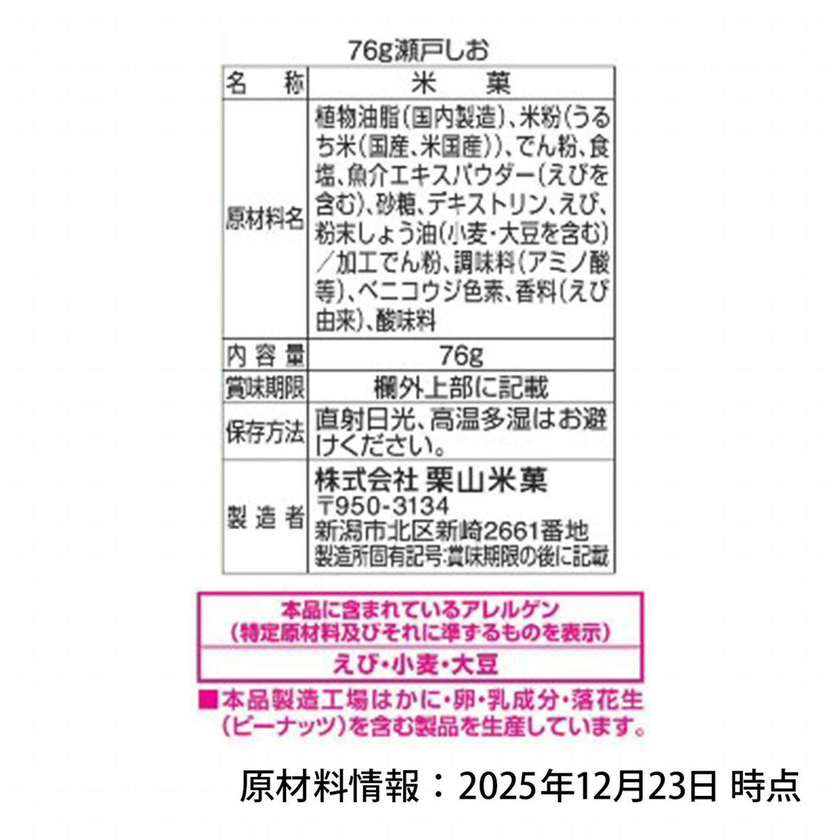 他の画像を見る 1個装あたり約12.6円(約13.6円税込)x約16個装入=202円(218円税込)ひと口食べたら止まらぬおいしさ。人気のやわらか食感の揚げせん 栗山米菓 瀬戸の汐揚 えび塩 76g(約16個装入) { 駄菓子 お菓子 瀬戸しお おせんべい 煎餅 揚げ煎餅 }{ おかし おやつ 景品 お祭り 縁日 問屋 子供 子供会 自治会 お子様ランチ 詰め合わせ 大量 まとめ買い 保育園 幼稚園 パーティー イベント }[25L23][dmo] メーカー希望小売価格 オープン価格 のところ 当店特別価格 ¥ 218 税込 カートに入れる お気に入りに登録する