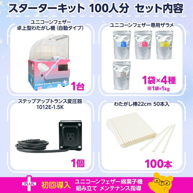 【スターターキット 100人 分】 ユニコーンフェザー 卓上型 わたがし機 (自動タイプ 変圧器セット)