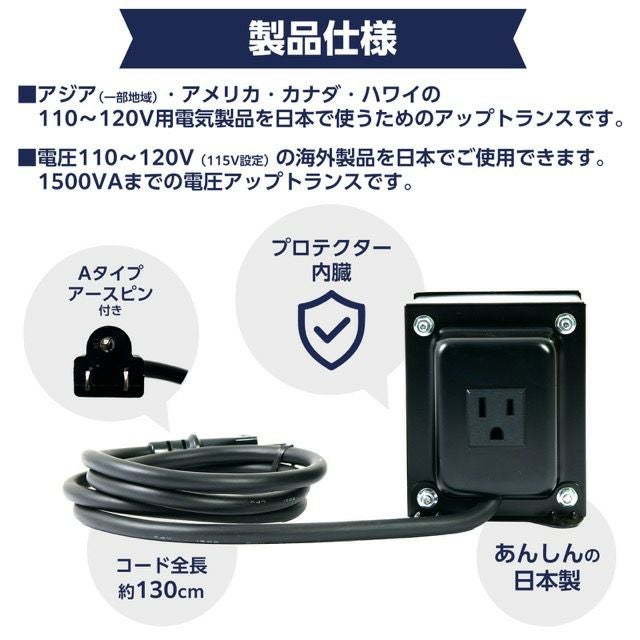【ユニコーンフェザー 卓上型 わたがし機 (自動タイプ) 対応】 1500VA AC100V → 昇圧 → 110-120V 変圧器 TGK 1012E-1.5K ステップアップトランス