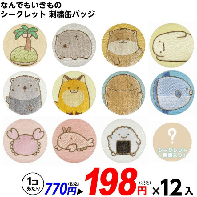 大人気、『なんでもいきもの』グッズ♪刺繍がかわいい、刺繍缶バッジです。
