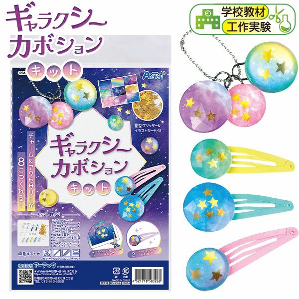 かわいいチャーム&アクセサリーがつくれるアクリル製の「カボション」というパーツを使い、まるでレジンのようなアクセサリーが簡単に作れるキットです。