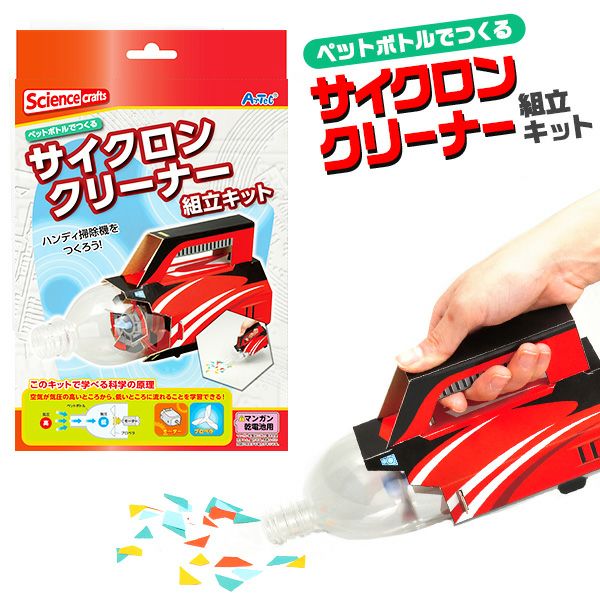 ペットボトルでハンディ掃除機をつくろう!空気が気圧の高いところから、低いところに流れることを学習できる工作キットです。