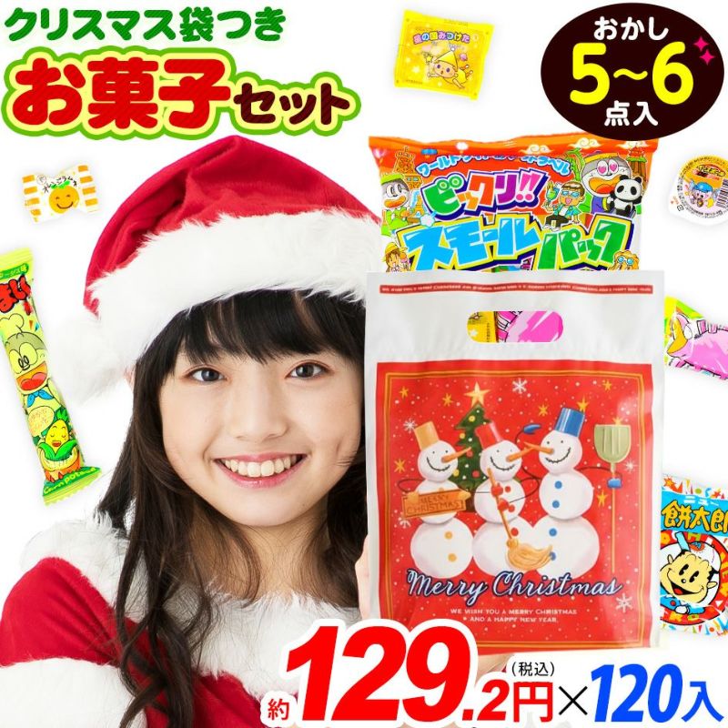 クリスマスイベントやパーティーにオススメ!スナックなど色々なお菓子が入った詰め合わせセット120個と、かわいいクリスマス柄の手提げ袋120枚をセットにしました!