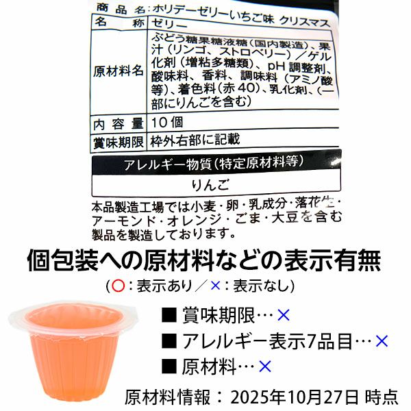 他の画像を見る 1個装あたり12円(13円税込)x10個装入=120円(130円税込)クリスマス 2025 おかし デザインもクリスマス仕様でかわいい♪ 七尾製菓 ホリデーゼリー いちご味 10個装入 { クリスマスお菓子 クリスマス お菓子 個包装 子供 ゼリー いちご イチゴ ストロベリー }{ おかし おやつ 詰め合わせ 業務用 個装 配布 子供会 自治会 保育園 幼稚園 パーティー イベント }[25L02][dmo]{即日出荷 配送区分D} メーカー希望小売価格 オープン価格 のところ 当店特別価格 ¥ 130 税込 販売を終了しました。 在庫切れ 再入荷お知らせ お気に入りに登録する