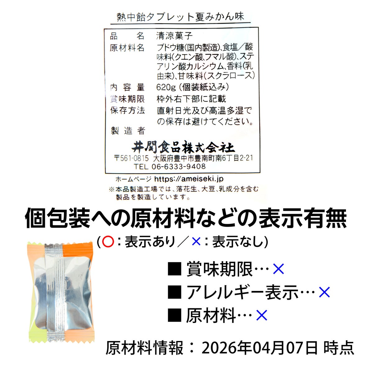 他の画像を見る 1粒に塩分量約300mg配合!「元気補給」「夏バテ対策」「夏みかん味」でリフレッシュ! 熱中飴 タブレット3 夏みかん 業務用 620g { 駄菓子 お菓子 飴 アメ タブレット 熱中症 対策 業務用 スポーツ 夏 みかん 塩分補給 }{ おかし おやつ 景品 お祭り 夏祭り 縁日 問屋 子供会 自治会 詰め合わせ 大量 イベント 配布 }[26C28][dmo] メーカー希望小売価格 オープン価格 のところ 当店特別価格 ¥ 2,355 税込 カートに入れる お気に入りに登録する