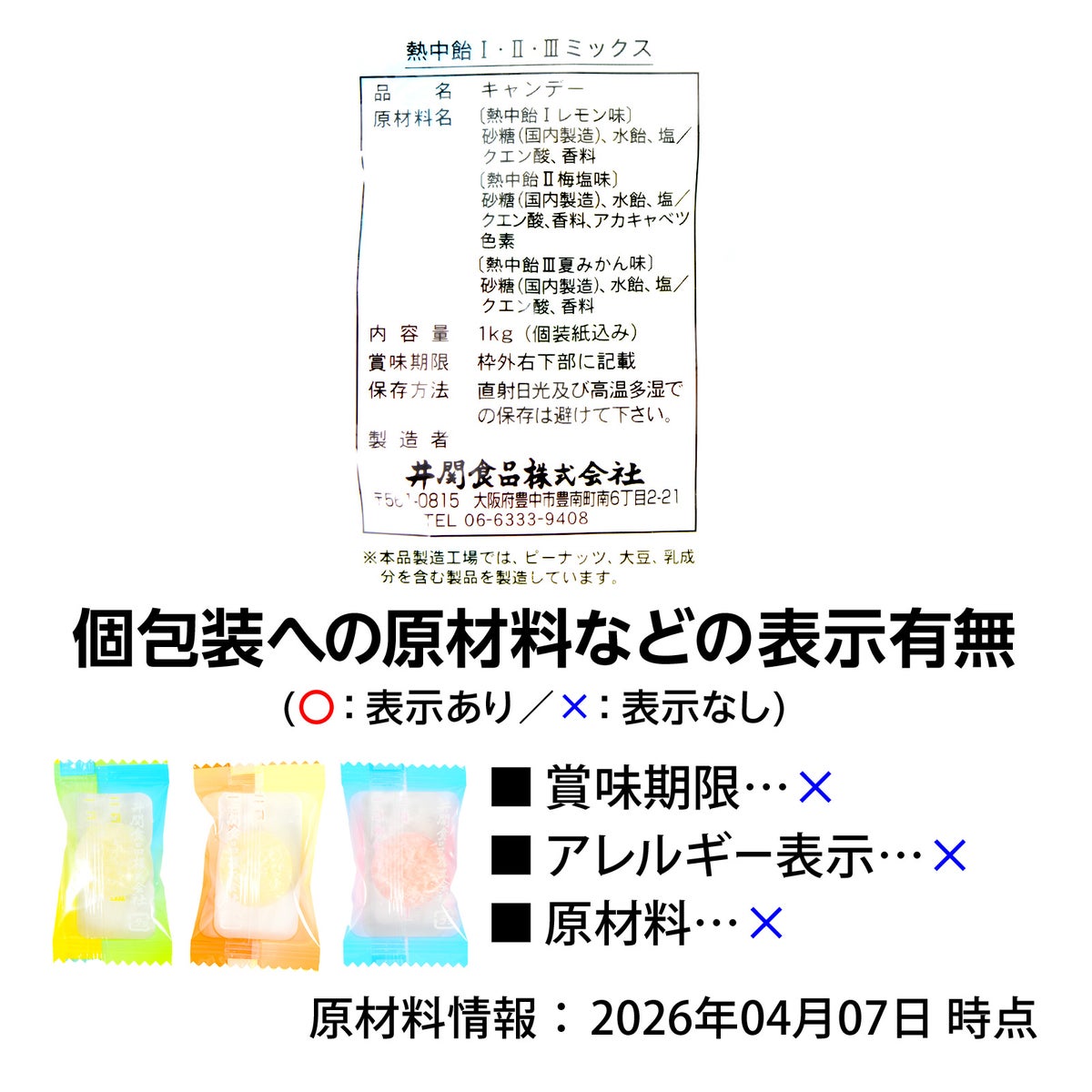 他の画像を見る 1粒に塩分量約300mg配合!「レモン味」「梅味」「夏みかん味」でリフレッシュ! 業務用 熱中飴 1 2 3 ミックス 1kg { 駄菓子 お菓子 飴 あめ アメ 熱中症 熱中症対策 業務用 スポーツ 夏 塩分補給 }{ おかし おやつ 景品 お祭り 夏祭り 縁日 問屋 子供会 自治会 詰め合わせ 大量 イベント 配布 }[26C28][dmo] メーカー希望小売価格 オープン価格 のところ 当店特別価格 ¥ 2,193 税込 カートに入れる お気に入りに登録する