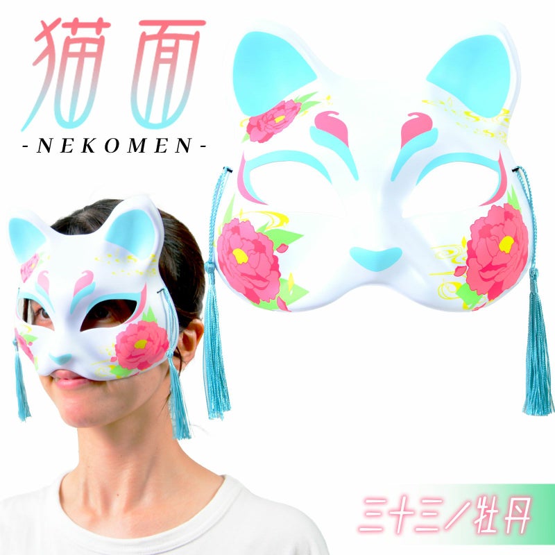 口元が開いた半面タイプに「牡丹」のデザインが入った、シンプルに粋でかっこいい猫面です。