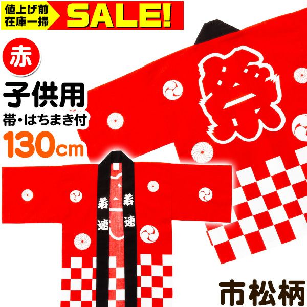 国産良品お祭りはっぴ 市松柄 子供 130cm 赤 (帯、豆絞りお祭り手拭付)
