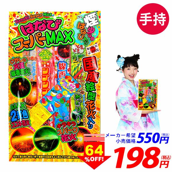 他の画像を見る 手持ち花火セットが64%OFF!!手持ち 花火 セット2023年度 新作花火! はなびスーパーMAX S 花火セット 手持花火 手持ち花火 手持ち 花火 セット { 花火 手持ち花火 手持花火 お得 }{ 花火 手持 手持ち セット キャンプ イベント 問屋 夏祭り 海 海水浴 人気 アウトドア 夏休み }301[25G20][dmo]{即日出荷 配送区分A} メーカー希望小売価格 ¥ 550 のところ 当店特別価格 ¥ 198 税込 カートに入れる お気に入りに登録する