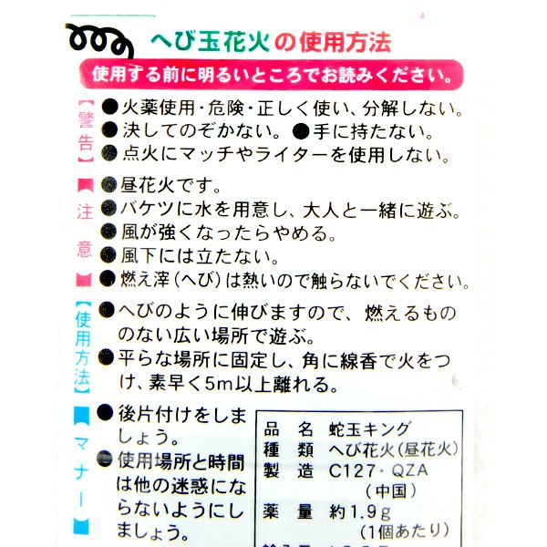 他の画像を見る にょろにょろまるでへびのような花火 雅 ヘビ玉 4個入 { 花火 へび ヘビ おもしろい 仕掛け花火 }{ 花火 花火セット キャンプ アウトドア イベント 縁日 景品 問屋 お祭り 子供会 自治会 人気 配布 手持花火 打上花火 噴出花火 夏休み }303[25D23][dmo] メーカー希望小売価格 オープン価格 のところ 当店特別価格 ¥ 135 税込 カートに入れる お気に入りに登録する