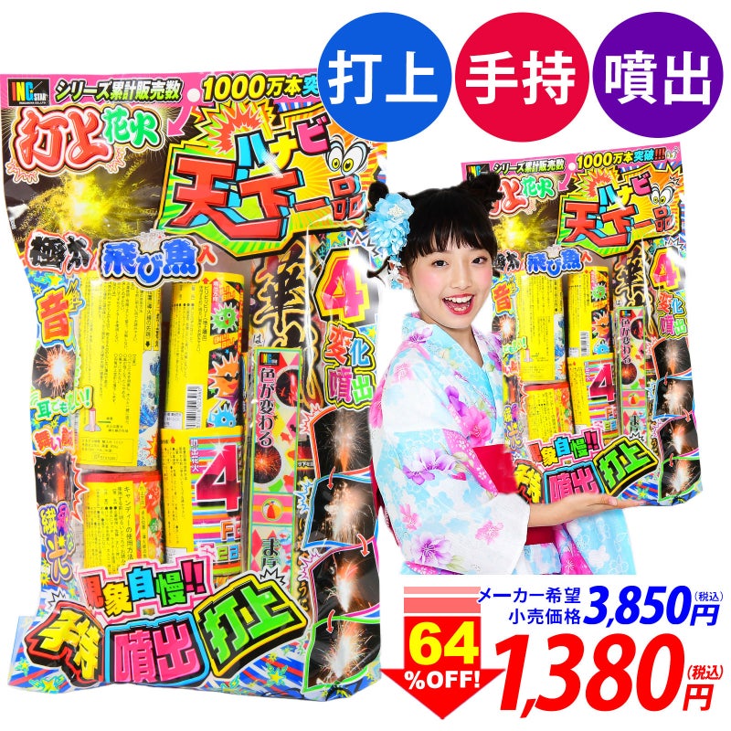 手持/噴出し/打上のオールセット花火シリーズ累計販売数1000万本超えの打上花火「飛び魚」、4回変化する噴出花火、音も楽しめる手持花火など現象に特長のある花火が入ったオールインワンタイプのセットです。