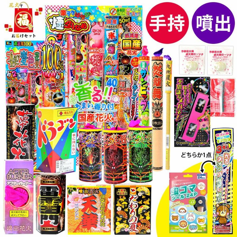 | 商品内容 | ・手持ち花火 36本 ・線香花火 12本 ・噴出花火 9個 ・点火用線香 1個 ・ゴミ袋 1個 ・注意書 1枚 ・不思議メガネ